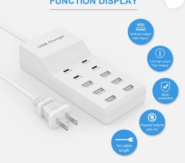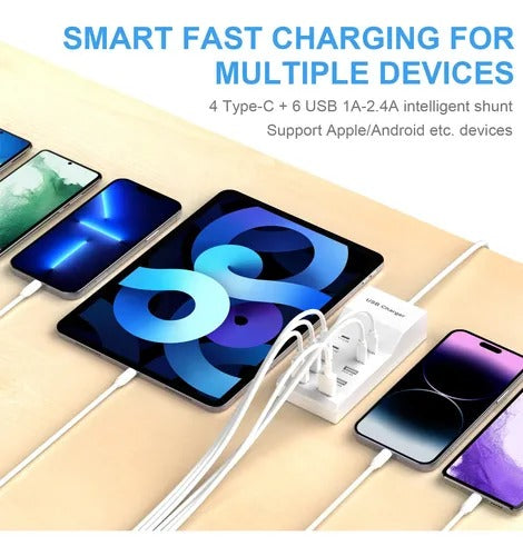 10 Puertos en Total: Espacio suficiente para conectar cargadores, computadores, consolas, monitores y mucho más.